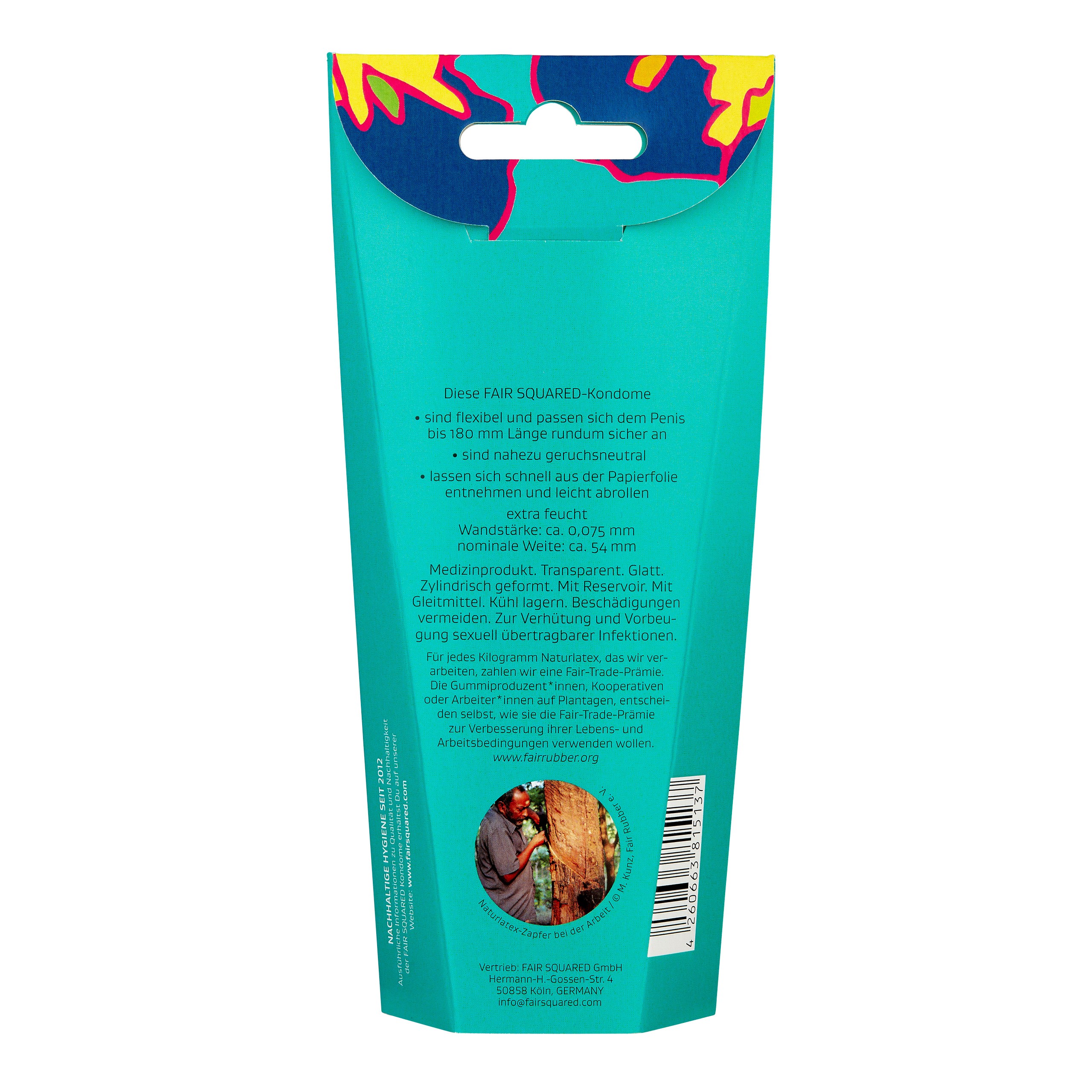 Der Naturkautschuklatex, der für unsere Qualitätskondome verarbeitet wird, wurde „fair gehandelt“ hergestellt. Unser Hersteller erhält einen Fair Trade Aufschlag, der ausschließlich für die Verbesserung der Lebens- und Arbeitsbedingungen der Plantagenarbeiter und ihrer Familien verwendet wird.